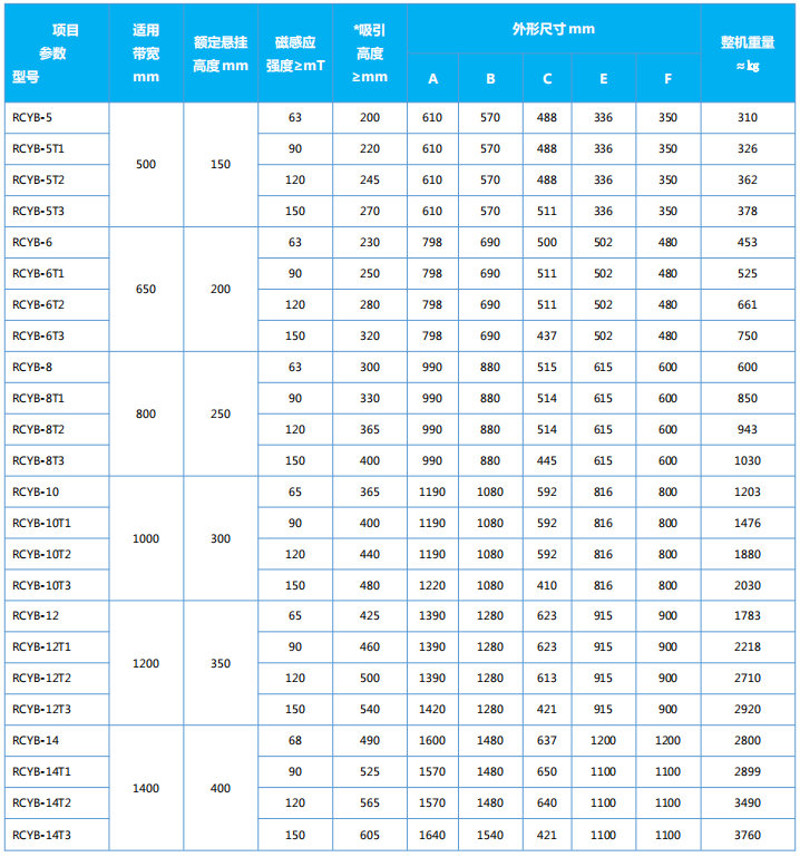 四、RCYB系列懸掛式手動永磁除鐵器主要技術參數、外形尺寸                      執行標準:JB/T8711