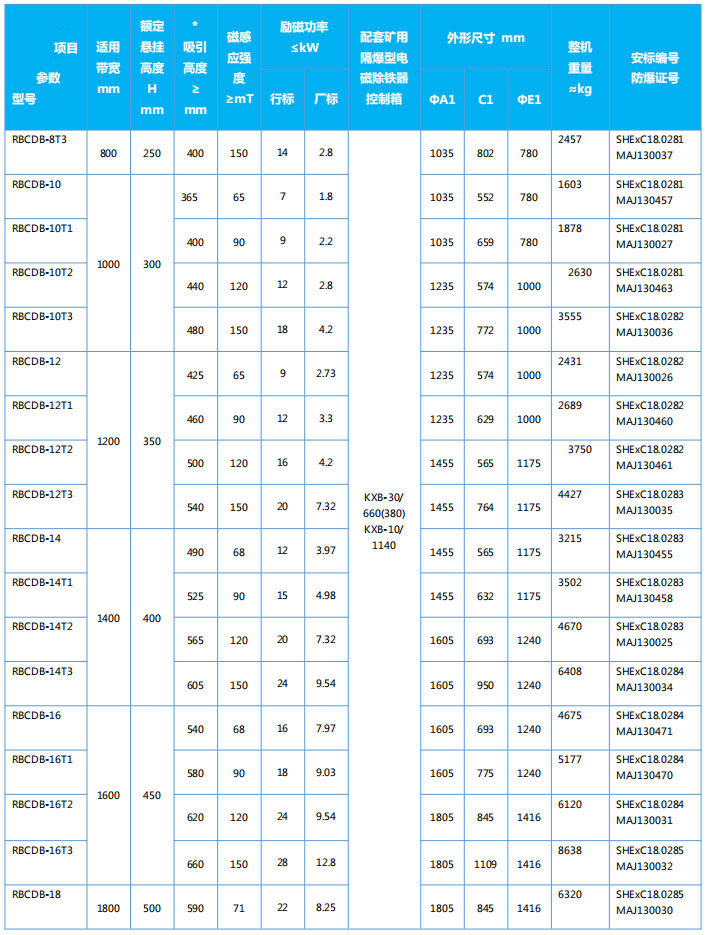 四、RBCDB系列隔爆型盤式電磁除鐵器主要技術(shù)參數(shù)、外形尺寸  執(zhí)行標(biāo)準(zhǔn):GB3836-2010、Q/321191ACL003