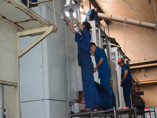 圖為施工人員對設備進行安裝工作。