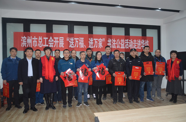 1月18日,由濱州市總工會開展的“送萬福、進萬家”書法公益活動走進公司,來自濱州市的著名書法家們現(xiàn)場揮毫潑墨,迎新開筆,為公司員工創(chuàng)作春聯(lián)、寫福,用筆墨送上新春的祝福。公司副總經(jīng)理孫玉濤致歡迎辭,市總工會女工委主任蔡紅霞講話并分別向華紡公司退伍軍人代表、勞動模范代表和一線員工代表,表達慰問和贈送春聯(lián),公司工會主席鄭安江主持活動。