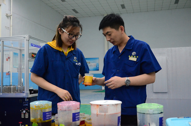 張甜甜(圖左)和張新華(圖右)二人,是多年來在公司花布車間從事專業技術工作的基層科技工作者,他們每天都為車間生產的印花產品精心調制著顏色。與其二人一樣,公司從事顏色調配的專業技術人員,每天都要完成一定數量的顏色調制;以花布車間為例,每人每天完成顏色調制在15-30個之間,并符合四級以上印花符樣標準。他們用自己的堅守與付出,演繹著一道旖旎多彩的風景線。