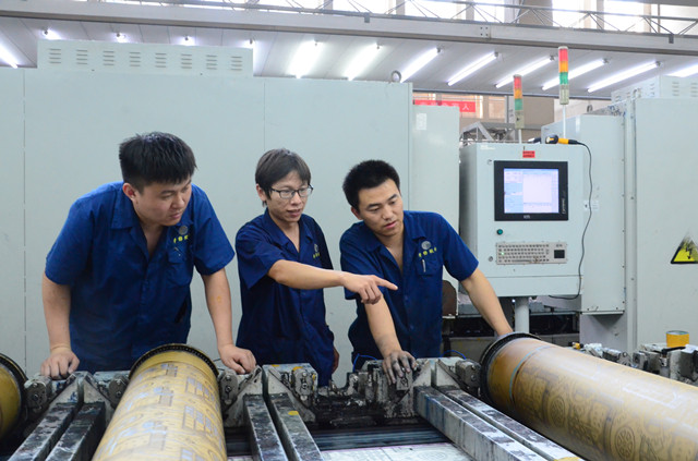 圖為輪班長張楠楠(中)與本班兩位印花機擋車工,在現(xiàn)場討論質(zhì)量改進的情形。