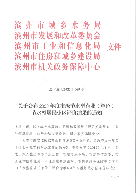 近日,濱州市城鄉水務局、濱州市發展和改革委員會、濱州市工業和信息化局、濱州市住房和城鄉建設局、濱州市機關政務保障中心發布了《關于公布2023年度市級節水型企業(單位)、節水型居民小區評價結果的通知》,經綜合評價,公司達到市級節水型企業(單位 )、節水型居民小區標準要求,獲評2023年度濱州市節水型企業。