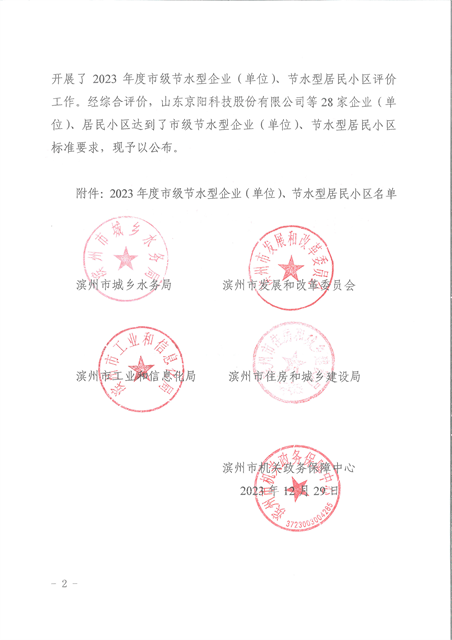 喜報!公司獲評2023年度濱州市節水型企業