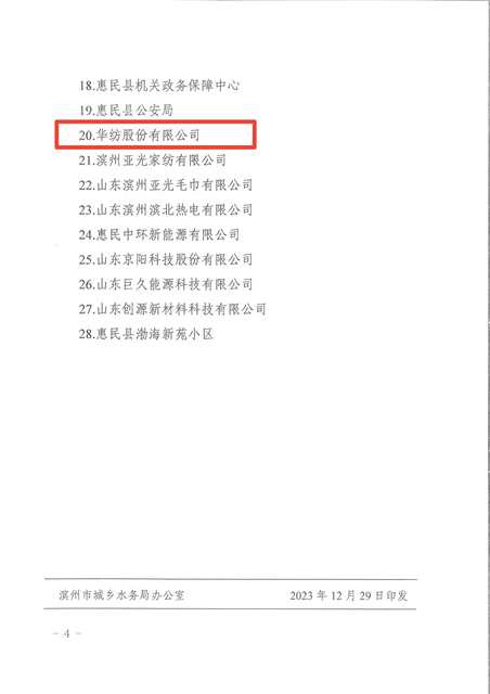 2023年,在全國紡織行業綠色發展勞動競賽中,公司榮獲節水標桿企業;在濱州市創建國家節水型城市省級復查工作中,公司高質量、高標準完成各項工作任務,為順利通過省級復查奠定了基礎。