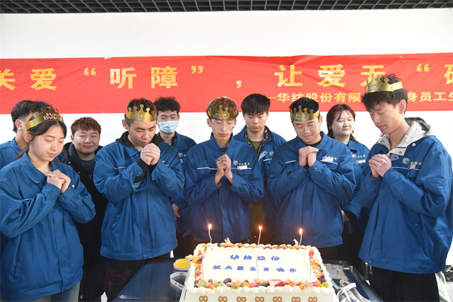 3月28日,公司黨委、工會、團委、關工委聯合舉辦了以“關愛‘聽障’”,讓愛無‘礙’”為主題的華紡股份有限公司單身員工生日會。公司黨委委員、人力行政副總經理孫玉濤,工會、團委、關工委主要負責同志、服裝車間相關負責同志以及30名聽障員工參加活動。