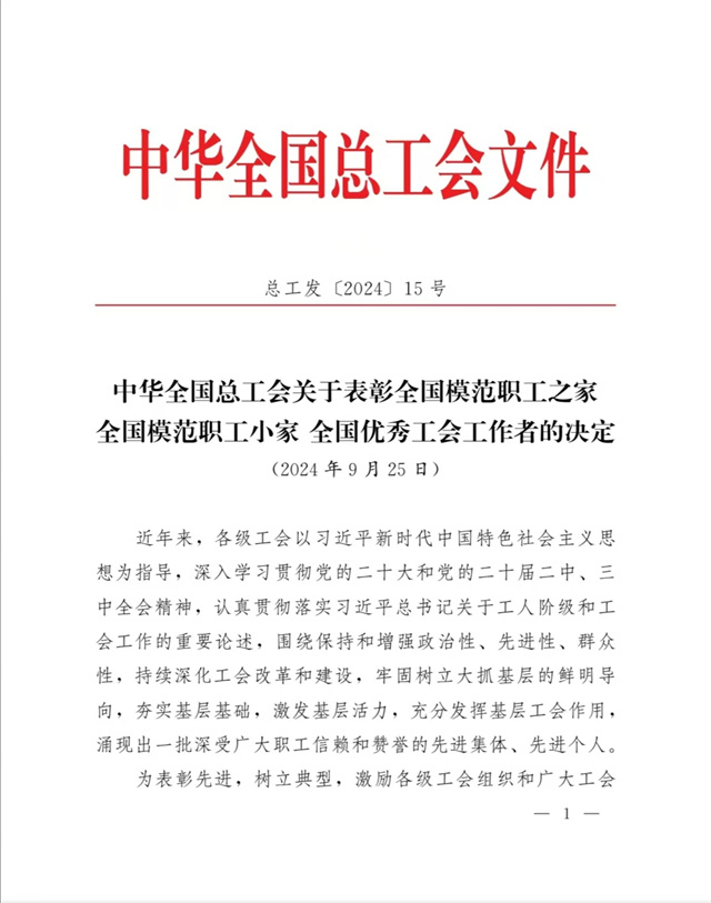 “全國模范職工之家”是中華全國總工會設(shè)立的授予全國工會系統(tǒng)先進集體的最高榮譽,是對基層工會工作的最高褒獎和肯定。公司工會在公司黨委領(lǐng)導下,以習近平新時代中國特色社會主義思想為指導,深入學習貫徹黨的二十大和黨的二十屆二中、三中全會精神,認真貫徹落實習近平總書記關(guān)于工人階級和工會工作的重要論述,牢固把握正確政治方向,充分發(fā)揮橋梁紐帶作用,切實維護職工合法權(quán)益,努力構(gòu)建和諧勞動關(guān)系,不斷增強工會組織的引領(lǐng)力、組織力、服務(wù)力,為公司高質(zhì)量發(fā)展貢獻工會智慧和力量。