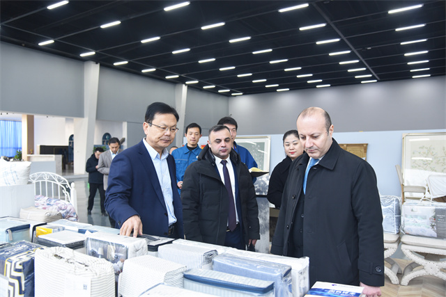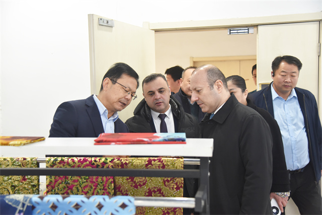 特穆爾·納迪羅格魯公使一行參觀了公司智云中心、檢測中心、綜合辦公區、服裝面料公司、花布公司、家紡公司、創意中心、研究院、花布車間、面料車間、家紡車間、家紡成品車間、服裝車間等區域,高度贊賞了公司在科技創新、環保實踐、產品多元化、產業布局等方面的成就。