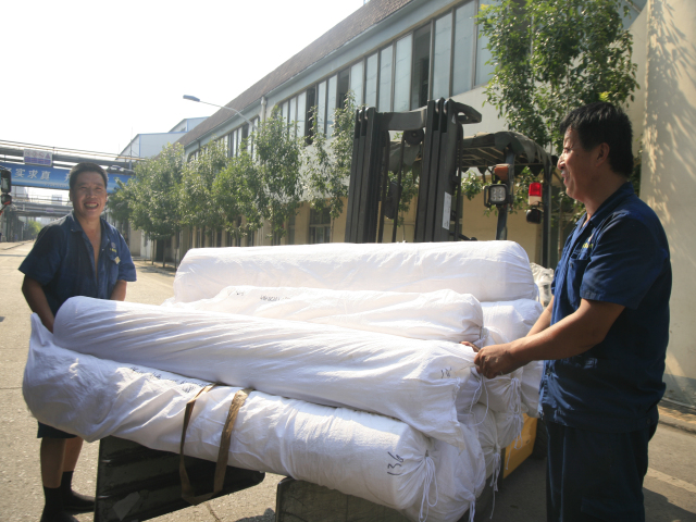 家紡車間前處理340絲光機出檢工李娟(圖左)與前來推布的360拉幅機進檢工朱濤交接產品。李娟說:“天氣越熱,我們越要互相提示,注重細節,保證安全,保證品質。”