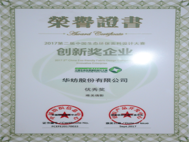 日前,由中國紡織工業(yè)聯(lián)合會主辦的中國國際面料設(shè)計大賽、中國生態(tài)環(huán)保面料設(shè)計大賽活動圓滿結(jié)束,公司在大賽中取得可喜成績,分別榮獲“2018/2019秋冬中國流行面料入圍企業(yè)”、“2017第二屆中國生態(tài)環(huán)保面料創(chuàng)新企業(yè)”榮譽(yù)稱號。