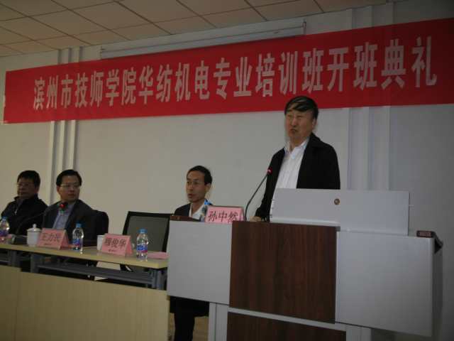 4月3日,公司與濱州市技師學(xué)院在公司工程技術(shù)研究院舉行“華紡機(jī)電專業(yè)培訓(xùn)班開班典禮”。開班典禮在莊嚴(yán)的國歌聲中開始,濱州市技師學(xué)院黨委副書記、院長丁愛軍,黨委委員、副院長穆俊華,公司黨委書記、董事長王力民,總工程師羅維新在主席臺就坐,并為學(xué)員代表授書,丁愛軍和王力民分別發(fā)表講話。