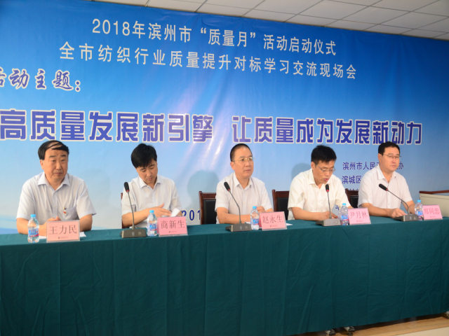9月5日,2018年濱州市“質(zhì)量月”活動(dòng)啟動(dòng)儀式暨全市紡織行業(yè)質(zhì)量提升對(duì)標(biāo)學(xué)習(xí)交流現(xiàn)場(chǎng)會(huì)在公司科技產(chǎn)業(yè)園舉行,會(huì)議由市政府秘書長(zhǎng)尹月林主持,副市長(zhǎng)、公安局長(zhǎng)趙永生,市質(zhì)監(jiān)局黨委書記商新生,濱城區(qū)副區(qū)長(zhǎng)鄭同忠,公司黨委書記、董事長(zhǎng)王力民出席啟動(dòng)儀式。