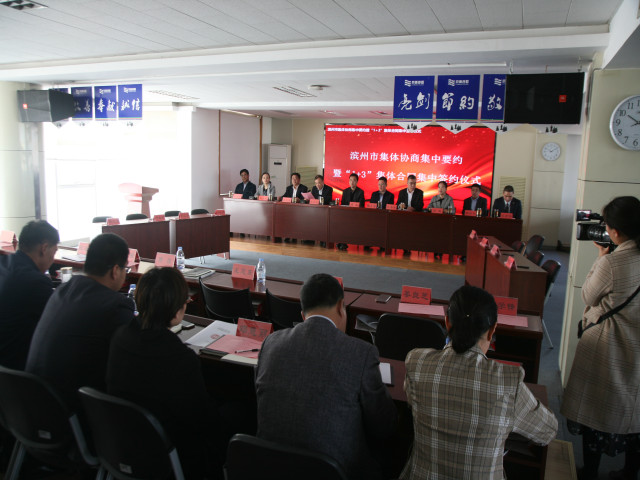 公司是全國紡織行業的優勢骨干企業,多年來規范協商、認真履行《集體合同》,在員工權益、安全生產及女職工保護等方面取得了良好成效,集體協商制度也為員工隊伍穩定、企業整體發展提供了有力保障。京博集團、渤海活塞等濱州市不同行業的優勢骨干企業,一同參加了當天的集中簽約儀式。圖為當天集中簽約儀式現場情形。